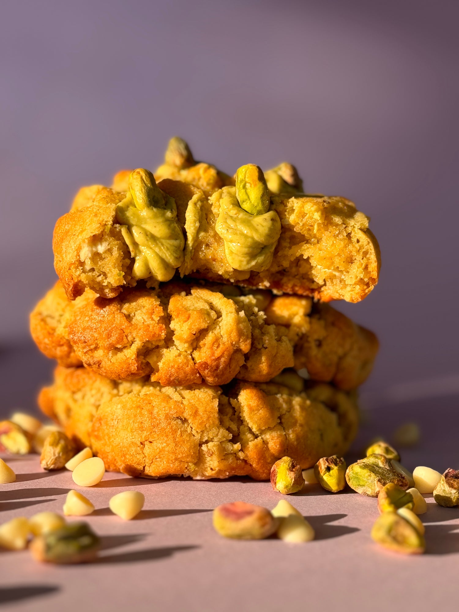 Handmade cookie dough made from the finest ingredients. Every bite is a flavour adventure, filled with white chocolate and crunchy pistachio pieces and homemade pistachio cream. Savour the irresistible taste and let yourself be tempted by our pistachio cookie!
